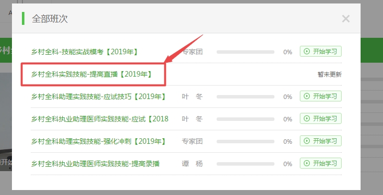 电脑端看课:从医学教育网首页进入“我的网校我的家”-“我的课程”-“乡村全科助理医师实践技能”-“提高直播【2019年】”(示例如下)