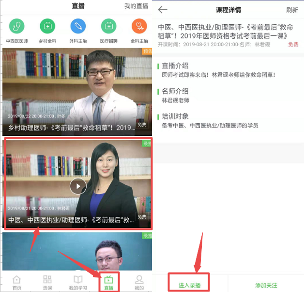 3、点击下方“直播”-->进入列表页,找到中医、中西医执业/助理医师技能老师直播课,点击进入后就可观看课程。