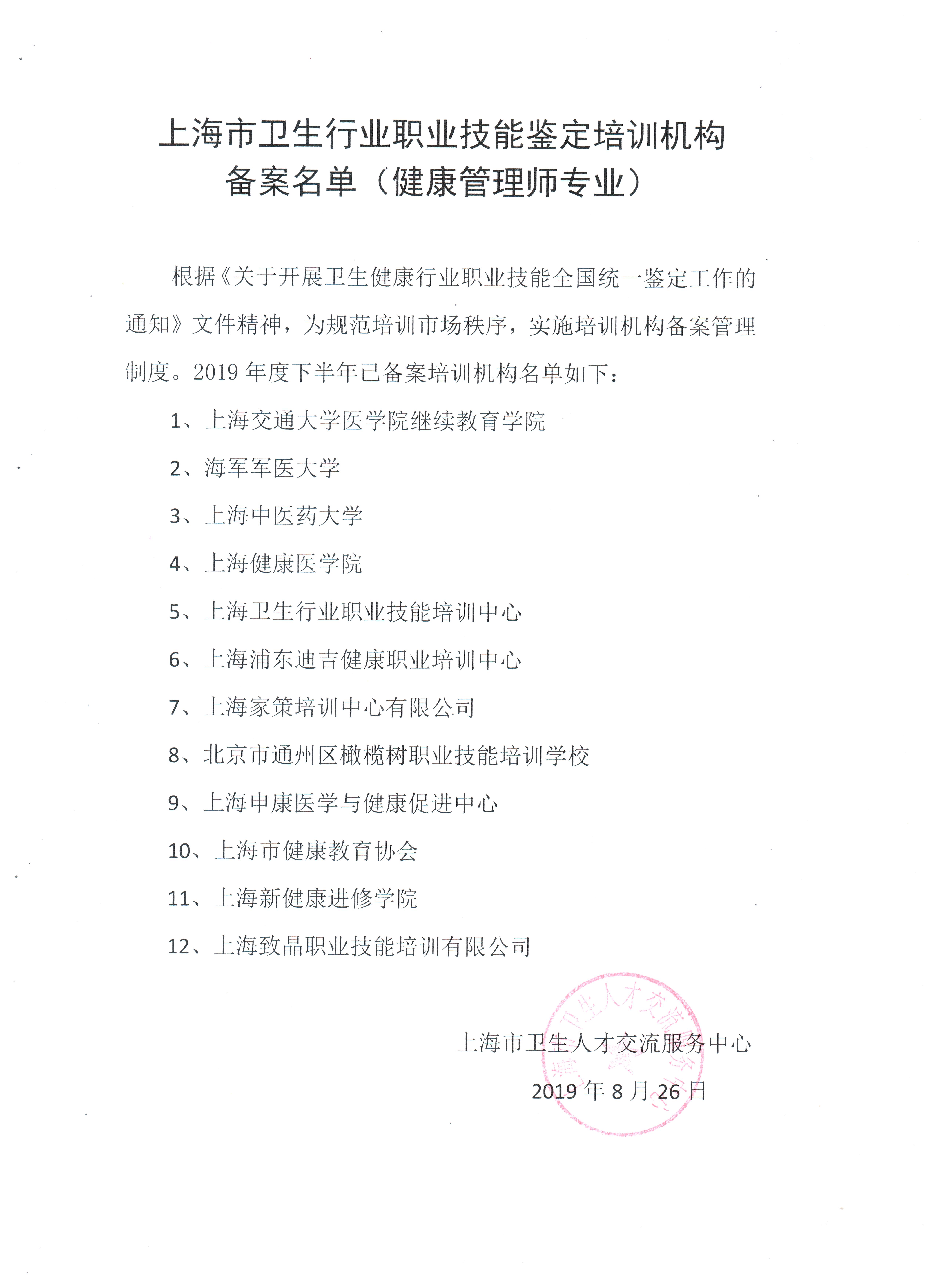 以上就是医学教育网关于“上海市健康管理师培训机构备案名单(2019年)”的相关介绍,希望能够帮助到大家,更多资讯尽在医学教育网!