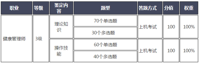 考试内容:内容涉及健康教育与促进、健康信息采集、健康风险评估、健康行为干预四大步骤; 涵盖健康管理概述、基础营养学、心理与健康、中医养生、运动与健康、环境与健康、健康营销与产业分析、职业生涯发展规划八大模块;特殊人群健康管理、常见慢性病健康管理、职业人群健康管理专业技能实战三大核心。