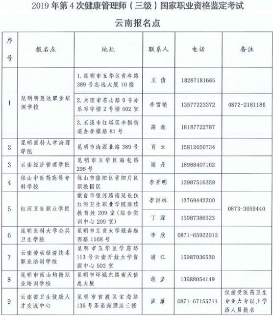 以上就是小编为大家整理的2019年11月健康管理师全国统一鉴定考试云南报名点,请大家多多关注医学教育网,我们会随时更新更多更好的关于医学知识、健康管理师考试辅导等相关内容,敬请期待!