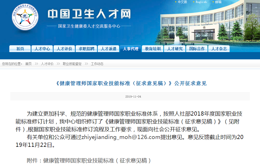 11月4日,中国卫生人才网发布了《健康管理师国家职业技能标准(征求意见稿)》,根据国家职业技能标准修订流程及工作要求,面向社会公开征求意见。公告申明:有关单位和公众可通过zhiyejianding_moh@126.com提出意见,意见反馈截止时间为2019年11月22日。
