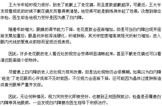 随着人们年龄的增加,老花眼是老年人群中时常患有的,但是当患有老花眼的朋友们,突然老花眼好了。大家就要留心,也许是白内障干的。下面就由医学教育网小编来为大家详细介绍为什么白内障能让老花眼突然变好吧。