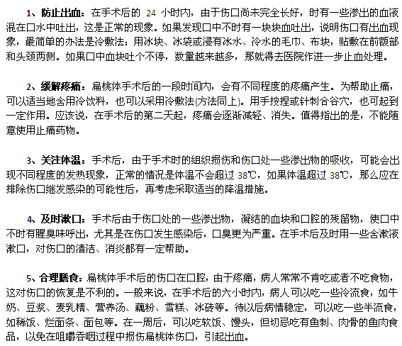 上面给大家介绍的就是扁桃体炎的术后护理,大家对于扁桃体炎要加以重视,小编还要提醒人们出现了疾病要选择好的办法进行护理并进行全面治疗,在此小编祝大家身体健康。