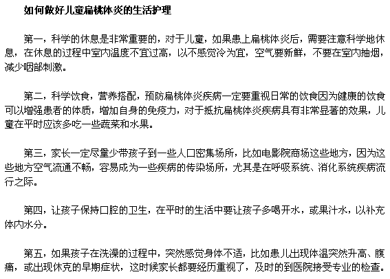 上面就是对于儿童扁桃体炎的生活护理的介绍,对于儿童群体,一定要注意在平时的生活中养成良好的饮食习惯,作息要规律,避免细菌或者病毒对儿童咽喉部的侵袭,一旦患上扁桃体炎,及时的采取治疗措施。