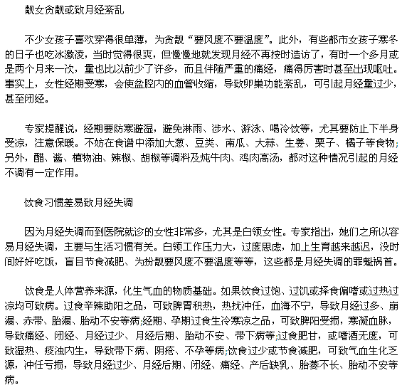 经过多、过少、经色异常、腹痛……女性的一生中,很多人都曾经患过月经失调。出现月经失调,多数人会到医院就诊,从盆腔炎、子宫肌瘤等方面去找原因。其实,很多月经失调并非由疾病引起,而是由不良生活习惯引起的。长期心情不好、压力大,乃至饮食过饱、过饥或偏食、挑食以及过热过凉都可能是月经失调的诱因。