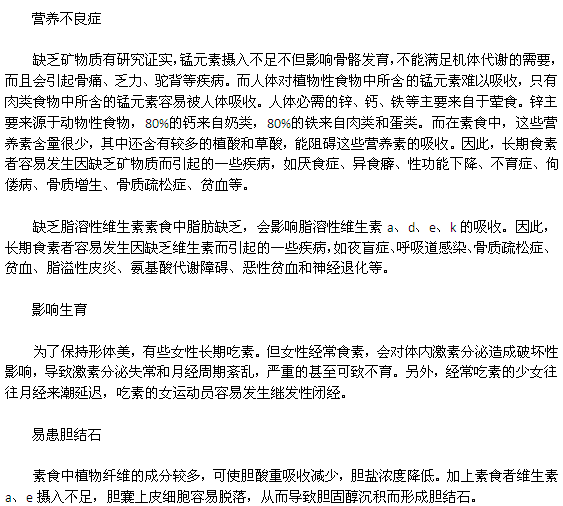 女性经常食素,会对体内激素分泌造成破坏性影响,导致激素分泌失常和月经周期紊乱,严重的甚至可致不育。随着人们生活水平的不断提高,人们开始认识到过度食入大鱼大肉等油腻食物,可能会催生许多疾病,因此,有的人终年不吃肉。事实上,单纯的素食会导致食物成分比例失调,同样会引起一些疾病,女性经常食素,会对体内激素分泌造成破坏性影响,导致激素分泌失常和月经周期紊乱,严重的甚至可致不育。