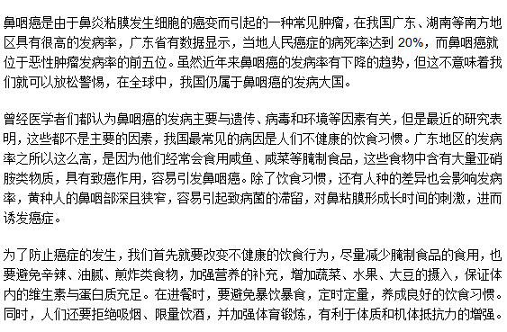 鼻咽癌具有很高的发病率和死亡率,我国人民喜爱吃腌制食品,患者会出现鼻子流血、鼻塞、耳鸣症状,想要预防疾病的发生,医学教育网编辑为你整理了相关内容。