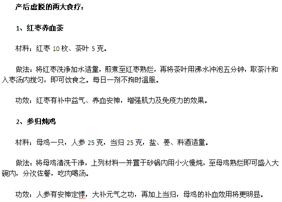 因为产妇在生产过程中,能量消耗又未能及时补充,在产后容易导致产后虚脱。产后虚脱即产后产妇出现面色苍白、周身出汗、四肢发冷,主诉头晕、乏力、有的出现恶心呕吐,甚者出现晕厥。产后虚脱常常见于产妇产后第1次下床活动或上厕所时。产妇很容易有产后虚脱,产妇一旦有产后虚脱,将会导致产妇的抵抗力低下,甚至影响产妇的身体健康,所以产妇要及时治疗产后虚脱。下面为大家介绍下产后虚脱的两大食疗。