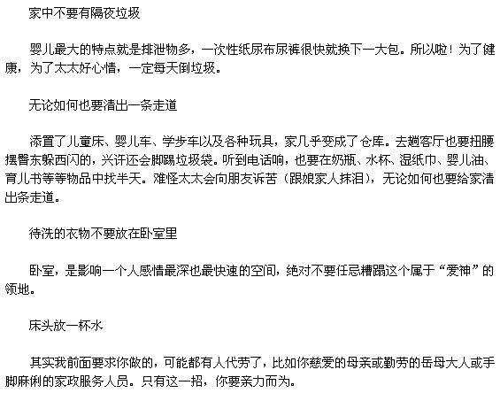 因为总是惦记着给宝宝换尿布、喂水喂奶、太太的睡眠质量非常不好。而一个长期缺觉的人,定是个火冒三丈的人。对她说:“宝贝,我寻到一个祖传秘方,说一个人睡眠不好,是因为床头有火,脑袋和神经无法冷却下来造成的。”用一只美丽的瓷怀盛满冰水放在床头。然后每天睡觉前把水换新,这样放一两个星期,就会有效果。赶快试试吧!反正一杯冷水也不用多少钱。太太也会因你的痴心而开心。