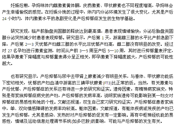 产后抑郁症是一种常见的女性精神障碍疾病,许多女性在产后会出现孤独、烦躁、自责等情绪,研究表明,大约有70%的女性在产后都会出现不同程度的抑郁症,这个数字随着经济的发展和生活水平的提高会逐渐增长。导致产后抑郁的因素有很多,内分泌变化就是其中原因之一,下面我们来了解一下。