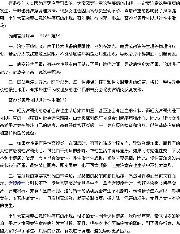 关于为什么宫颈炎会一“炎”难尽,宫颈炎患者如何进行性生活的问题,相信很多患有宫颈炎的人都比较相了解,为此医学教育网编辑特整理了相关内容如下: