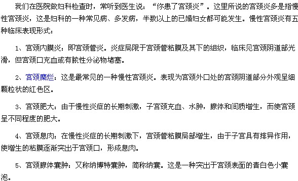 慢性宫颈炎的五种临床表现形式具体是什么?相信很多女性朋友尤其是已婚的女性朋友都很关注,医学教育网编辑专门为您整理了“慢性宫颈炎的五种临床表现形式具体是什么?”这篇文章,供您阅读。