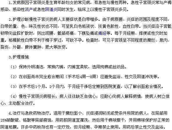 以上是慢性子宫颈炎的发病原因及护理措施的相关内容,相信大家已经有所了解,医学教育网小编提醒大家,平时要注意个人的卫生,做好防护工作,一旦发现患有慢性子宫颈炎这种疾病要及时到正规的妇科医院进行治疗。