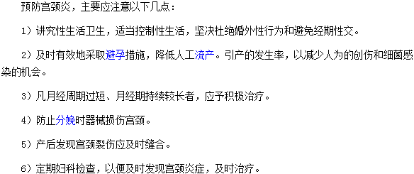 以上是预防宫颈炎要注意的六个方面的相关内容,相信大家已经有所了解,医学教育网小编提醒大家,平时一定要注意个人的卫生,做好防护工作,如果发现患有宫颈炎这种疾病要及时到正规的妇科医院进行治疗。