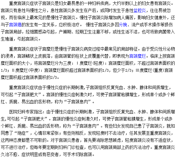 以上就是重度宫颈炎的主要症状表现的具体内容,相信大家已经有所了解,重度宫颈炎会给女性带来很大的危害,平时一定要注意个人的卫生,做好防护工作,一旦发现患有宫颈炎这种疾病要及时到正规的妇科医院进行治疗。