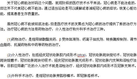 冠心病能治好吗?这种问题一般是冠心病病人和他们的家属最关心的问题。虽然说,目前还没有能够彻底解决冠心病的办法,但患者通过积极有效的治疗,是可以跟平常人一样生活。所以大家要有一个积极良好的心态。