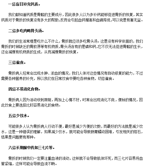 骨折是一种常见的意外性疾病,有些人在工作与生活中不注意,就会引起骨折。所谓伤筋动骨一百天。骨折患者更需要长时间的疗养,除了正确的治疗以外,在饮食上也要注意一些饮食禁忌,下边小编就详细的介绍一下: