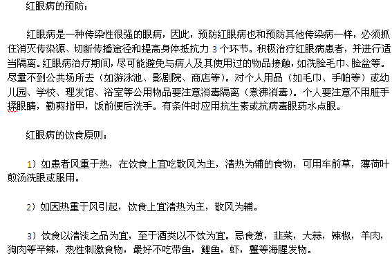 现在关于红眼病的预防和饮食您了解了吗?小编提醒您得了红眼病不要惊慌,只要使用的得当的治疗方法即可。真心的希望我们的分享能够为您提供帮助!请您务必要时刻注意眼睛的情况,如果眼睛感到不适,一定要听从医生的建议与指导,规律生活,如果发现异常,及时与医生沟通。在此您身体健康!