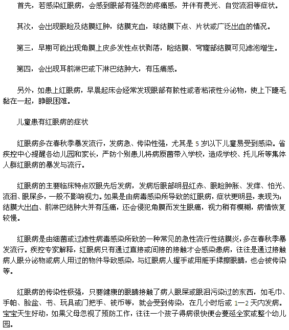 小编已经给大家总结了儿童患红眼病的发病表现形式,相信各位朋友对红眼病有了一个更为详细的了解。在预防儿童患红眼病的工作中,家长的任务是十分艰巨的。家长应该教育好自己的孩子注意眼部卫生工作,让孩子从小保护自己的眼睛,当发现有不适症状时,及时就医,将红眼病的萌芽扼杀在摇篮里。