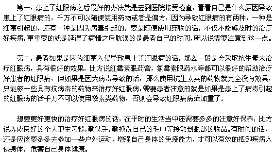 红眼病在春秋季节出现比较多,因为细菌滋生导致眼部感染所致,一定要进行治疗才能痊愈。出现红眼病这样的疾病我们应当采取哪些方法进行治疗呢?