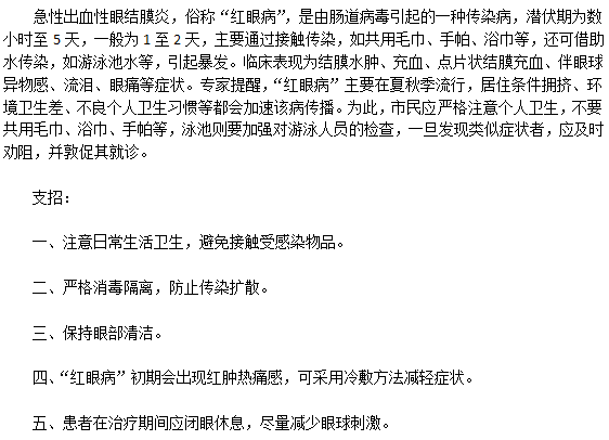 文章中小编对于红眼病给了一些介绍,了解完这些内容以后,大家对红眼病也有了深刻的认识,红眼病是一种细菌引起的炎症疾病,我们在生活中也要积极的进行预防,这样对我们的健康才能带来非常大的保障。