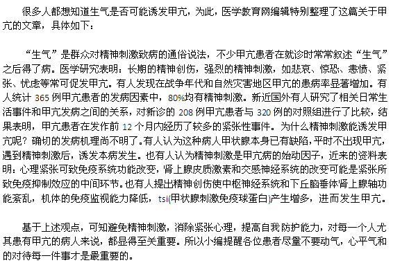 很多人都想知道生气是否可能诱发甲亢,为此,医学教育网编辑特别整理了这篇关于甲亢的文章,具体如下: