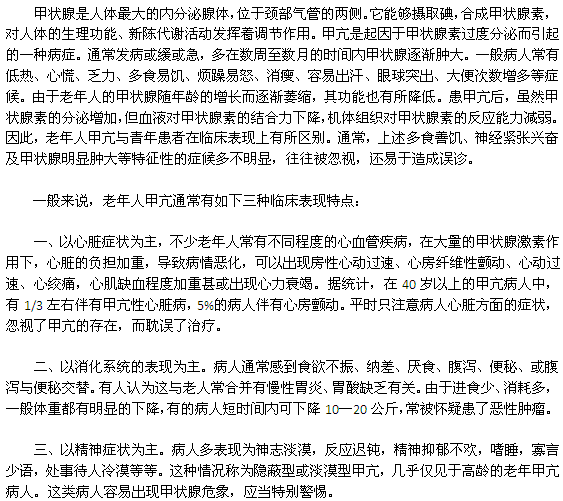 甲状腺机能亢进(简称甲亢),多见于青年女性。但60岁以上的老人也可发生甲状腺机能亢进,约占全部甲亢病人的10—17%,一般认为和更年期内分泌失调有关。下面小编给大家介绍下老年人和甲亢: