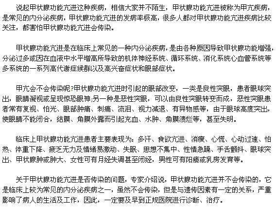 以上就是针对甲亢会不会传染的详细介绍,相信广大患者现在对甲亢疾病都比较清楚了,建议广大患者在治疗的时候,一定要好好的配合医生的治疗,同时还要对自己有信心,这样才能抵抗住疾病。