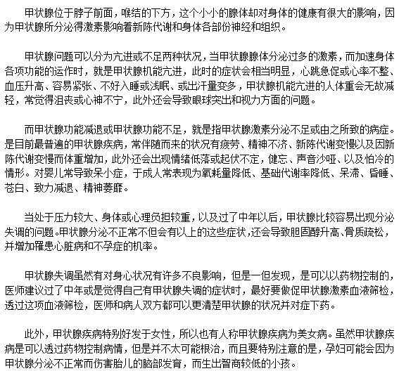 因此,医师建议,保养甲状腺是一辈子的事,平时最好不要熬夜、不要太劳累,避免作息不正常,并且注意自己是否有甲状腺失调的症状,年过35岁的女性及超过50岁的男性则应每年定期作筛检。
