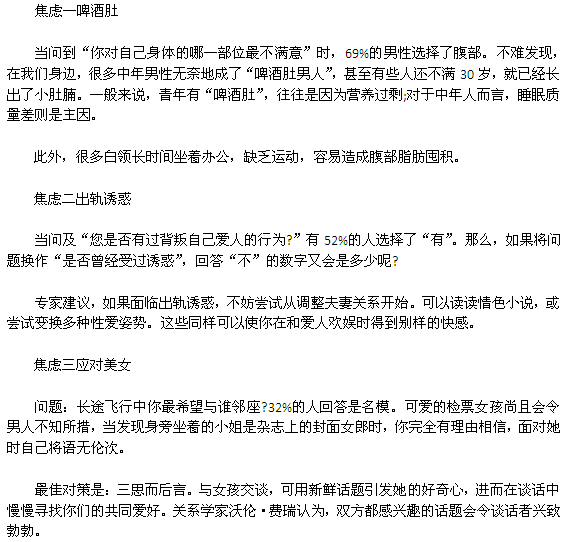 在大多数人心目中,男人是强者的代名词。然而,这些铁打的“硬汉”却常常被社会压力和家庭责任搞得疲惫不堪。日前,美国《男性健康》杂志对其全球男性读者的一项调查结果显示:男人们内心的焦虑普遍来自十个方面,其中有三个比较关键。除了“衰老”、“工作枯燥”、“啤酒肚”,“出轨诱惑”、“应对美女”也让他们苦恼。那么,造成这些困扰的深层次原因到底是什么?究竟采取哪些对策,这些烦恼才会迎刃而解呢?