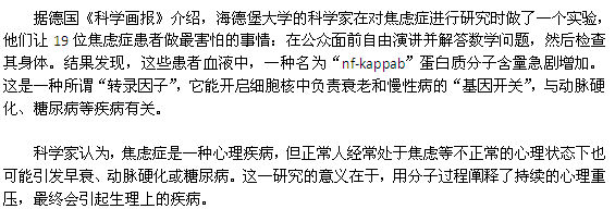 “焦虑催人老”这句俗话并非没有根据。德国科学家新近发现,焦虑症能开启人体内促使细胞衰老的基因,进而引发多种疾病。下面小编就带您了解下焦虑症是如何让人变老的。
