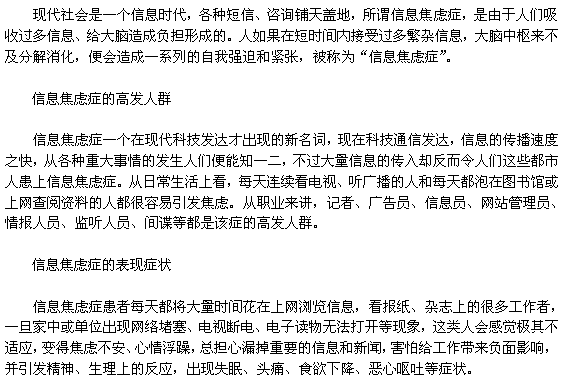 焦虑症是一种很常见的疾病,一般20岁到40岁之间的人群是比较容易发病的,您知道吗?现在白领一族容易患信息焦虑症,想知道什么是信息焦虑症吗?相信您看了这篇文章,您就了解了。