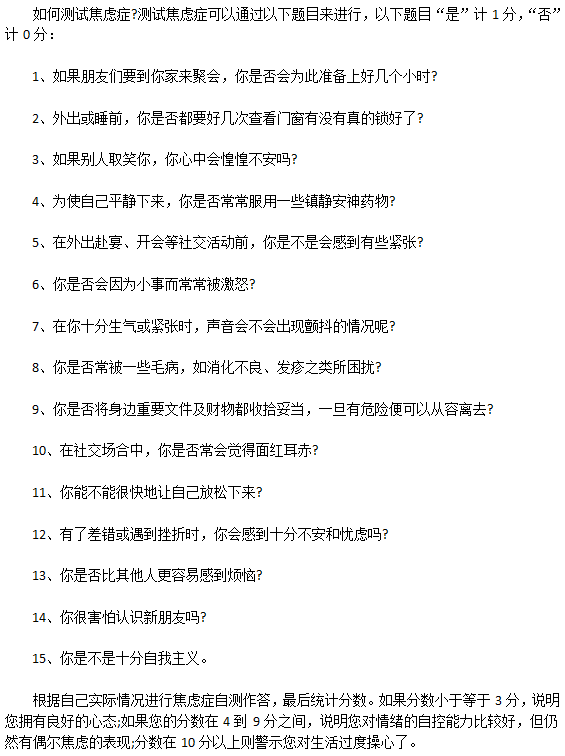 如何测试焦虑症?以上介绍就是对测试焦虑症这个问题的回答,相信通过以上介绍之后,大家对焦虑症的测试已经了解的非常清楚了。做好焦虑症的测试不仅可以帮助我们更加了解自己的内心,还可以帮助我们及时发现自己内心的缺点,正确的对待这些焦虑情绪,并且及时处理是对身体有益的,希望以上介绍对大家有所帮助。
