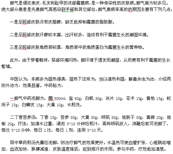 以上就是由医学教育网搜集整理关于中药治脚气的相关信息。我们对于脚气这种疾病的最终治疗目的,就是能够让双脚恢复健康,告别脚气,所以患有骨折这种疾病的患者,要越发的注意自己脚部的健康和卫生,也希望患有这种疾病的患者,能够早日康复,真心的希望我们的分享能够为您提供帮助,在此祝您身体健康!