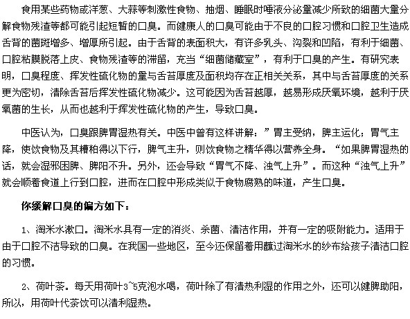 以上就是“淘米水漱口或者喝荷叶茶可以缓解口臭”的内容,通过医学教育网小编带领大家阅读了这篇文章,相信大家已经有所了解了,口臭平时一定要养成良好的生活习惯,定期做口腔检查,发现口腔疾病要及时治疗,这样才能彻底摆脱口臭带来的尴尬。