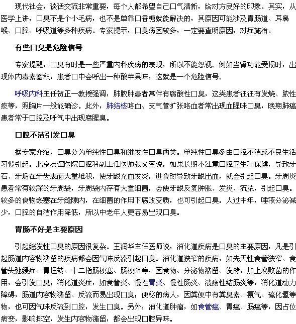 如果您或家人朋友患了口臭,相信这篇关于“口臭的危险信号:胃肠不好|口腔不洁都是引发口臭的原因”的文章会对您有帮助,医学教育网编辑现将具体内容为大家介绍如下: