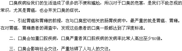为什么说口臭是引起胃癌和胃瘫的前提呢?通过以上文章中的介绍,相信您已经有了一定的了解了,医学教育网小编提醒大家:发现口臭的病情一定要及时到正规的医院进行治疗,这样才能有更好的治疗效果。