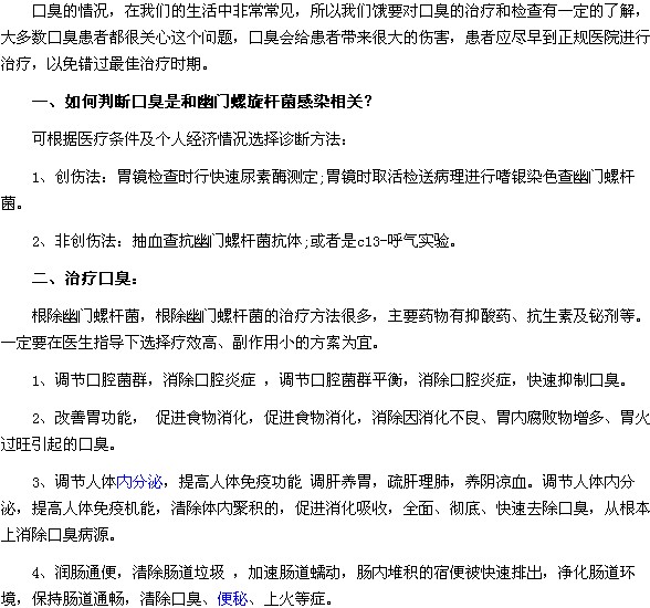 如何判断口臭是和幽门螺旋杆菌感染相关?通过以上内容的介绍,相信大家已经了解了,在日常生活中要注意对口臭的预防,如果您出现了口臭类的症状,一定要及时进行治疗,平时也要注意护理的工作。