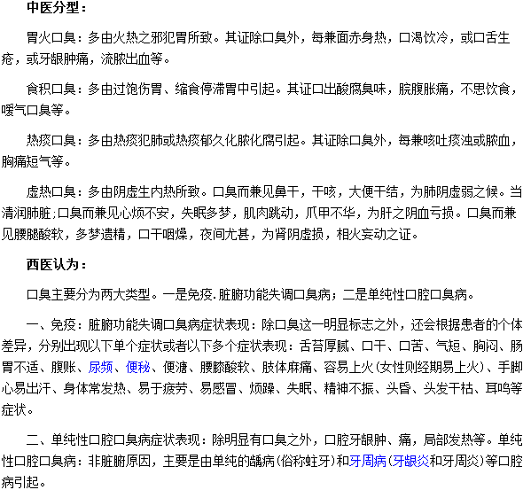 口臭就是口腔中发出难闻的气味,是一种常见的口腔疾病,其证型不同,伴随的症状表现也有不同。那么,口臭的中医分型与西医分类是什么呢?下面就跟随医学教育网小编一起来了解一下吧。