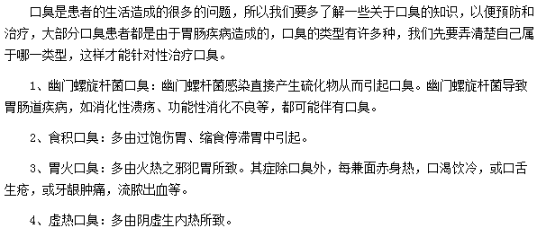 造成口臭的四种类型具体是什么?通过以上文章中对于口臭的类型的介绍,相信您看完后已经有了一定的了解了,希望能够给您带来一些帮助。发现口臭的病情一定要及时到正规的医院进行治疗,这样才能有更好的治疗效果。