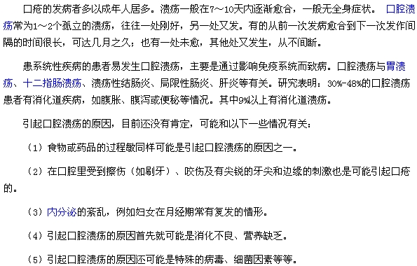 为什么口疮发病者成年人居多?口疮发病原因是什么呢?口疮是日常生活中比较容易出现的疾病,口疮出现的原因是什么呢?医学教育网小编搜集整理如下可能与口疮发生有着密切联系的因素,希望对大家有所帮助!