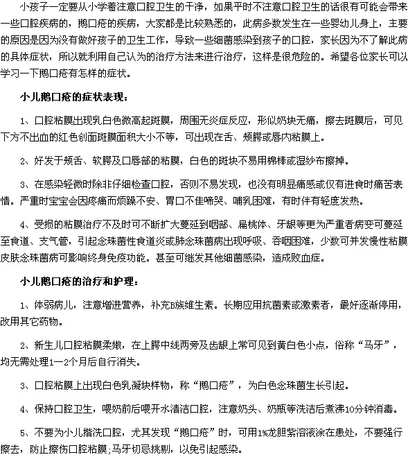 通过阅读以上小编介绍给大家的小儿鹅口疮的症状表现及治疗护理方法后,家长们对于小儿鹅口疮的症状表现及治疗护理方法应该已经了解了,鹅口疮出现的时候带有的症状还是比较明显的,为了孩子的健康着想,家长们要多多注意孩子的身体变化情况。
