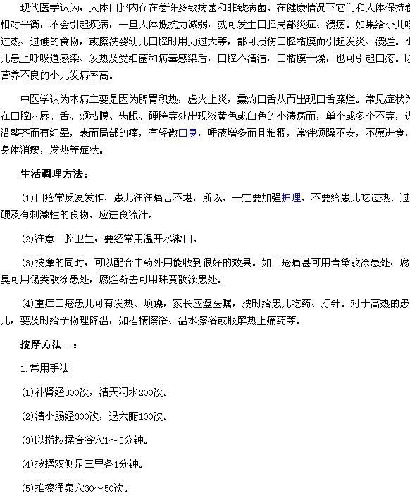 关于小儿口疮的生活调理方法是什么?按摩治疗小儿口疮的方法有哪些?的问题,相信很多患有小儿口疮的家长朋友都很关注,为此,医学教育网小编特整理了以下的相关文章,供家长朋友们阅读参考。
