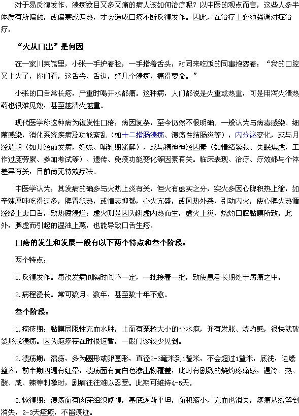 以上“口疮发生和发展的特点及阶段是什么?”的内容就为大家介绍完了,相信大家在看了上述文章以后,对口疮发生和发展的特点及阶段已经有所了解,希望对大家有帮助。