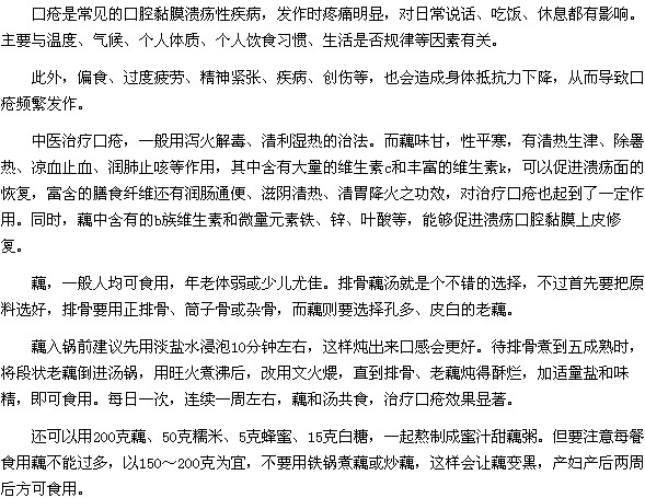 治疗口疮疾病的食疗方法是什么?很多患有口疮又不想吃药的朋友们一定都特别关注这个问题,医学教育网小编就为大家分享一个治疗口疮疾病的食疗方法--排骨藕汤,那么,这道排骨藕汤怎么做呢?下面就让小编为大家介绍一下吧。