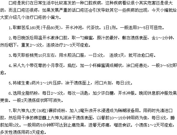 以上就是巧治口疮你需要知道的七个小偏方的具体内容,相信大家已经了解了,其实这些方法都很简单,只要在家里就可以解决,如果您现在患有口疮,不妨试一下,希望对您的康复会有所帮助。
