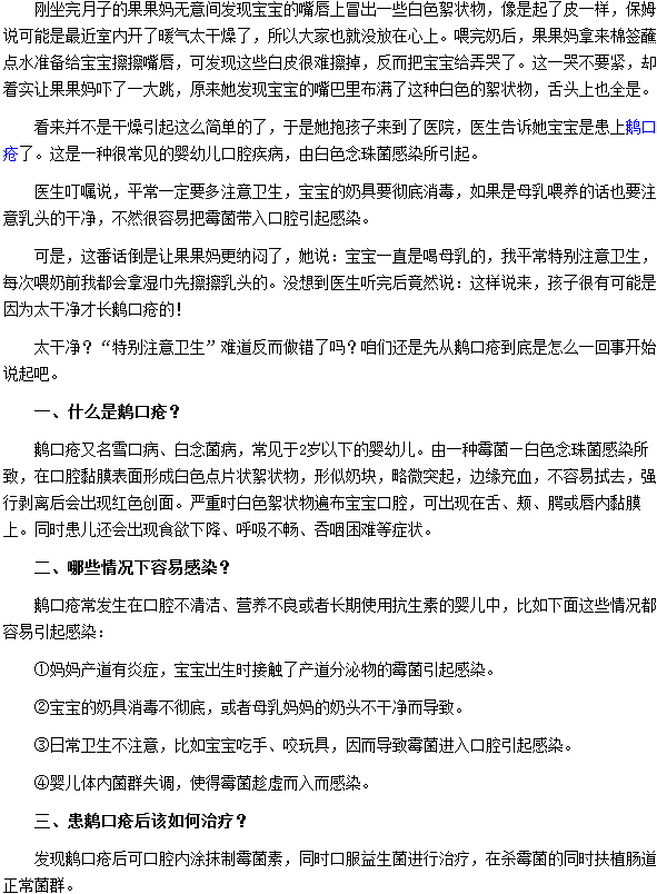 相信通过对“太爱干净也会导致宝宝患上口疮”这篇文章的阅读,相信大家对此问题都有了基本的认识,爱干净是好事情,但爱到追求无菌效果就大错特错了。一旦宝宝的肠道内菌群失调,除了有可能引起鹅口疮,更多的时候会让宝宝的肠胃受损引发腹泻,甚至导致肠胃炎等疾病的发生。