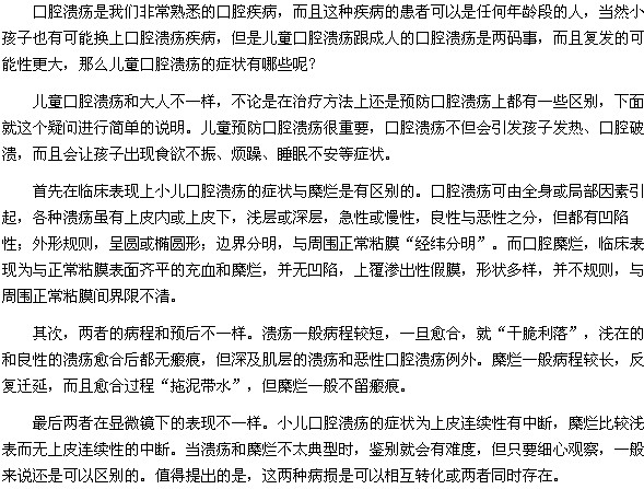 以上就是“儿童患上口腔溃疡能够用成人药品治疗吗”的相关内容,有些家长没有引起足够的重视,通常买些给成人用的药品给孩子用,这些方法是不正确的,宝宝的皮肤娇嫩,很多大人的药物是不能用的,医学教育网小编建议广大家长朋友到医院进行检查,进行正规的治疗,以免给孩子造成复发的后果。