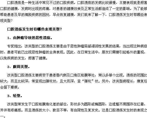 口腔溃疡发生时有哪些表现类型?相信很多患有口腔溃疡的朋友都很想了解,为此,下面医学教育网小编特整理了口腔溃疡发生时有哪些表现类型的这篇文章,供大家参考阅读。